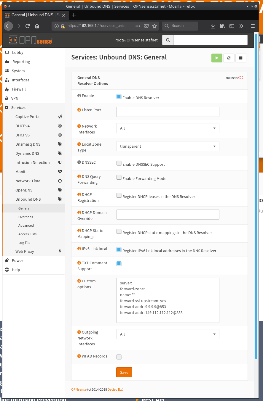 to ** Custom options ** these settings will reconfigure Unbound to forward the dns for the upstream dns servers Quad9 over ssl.